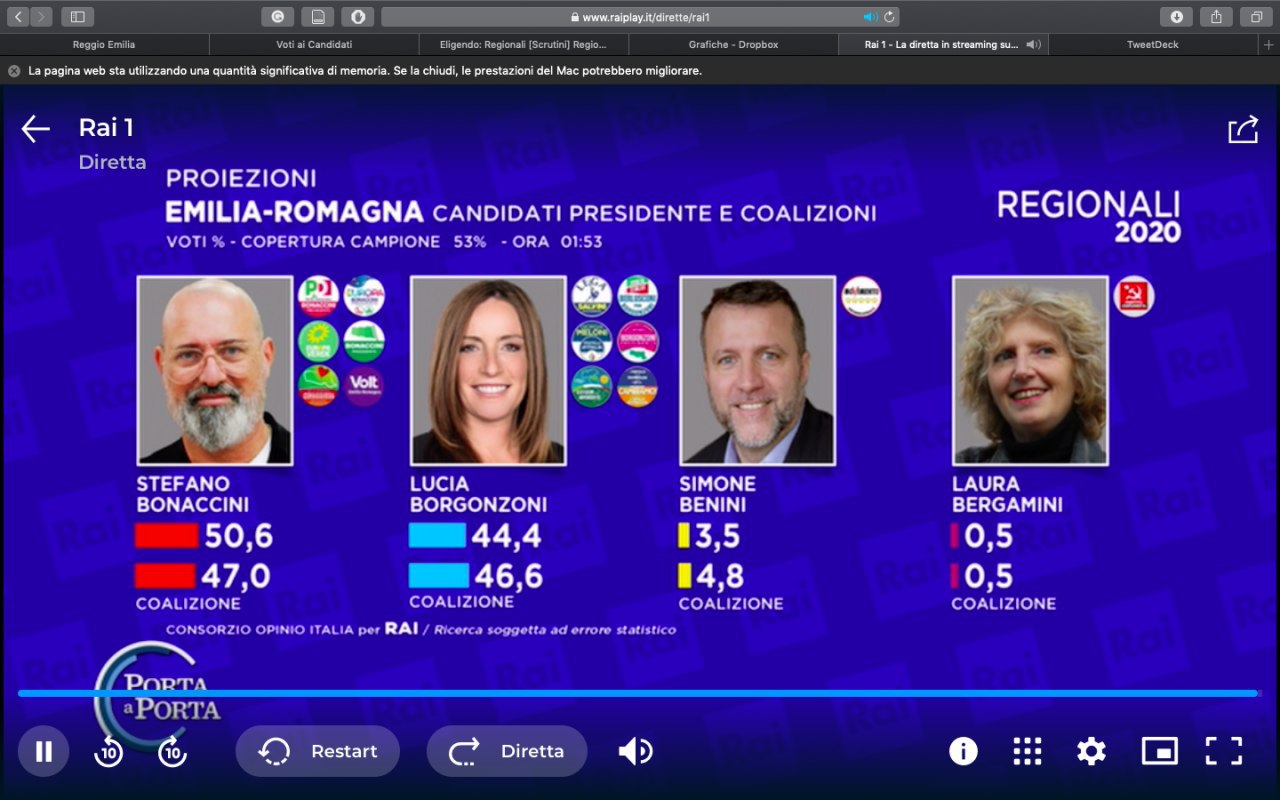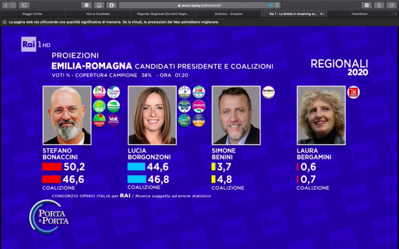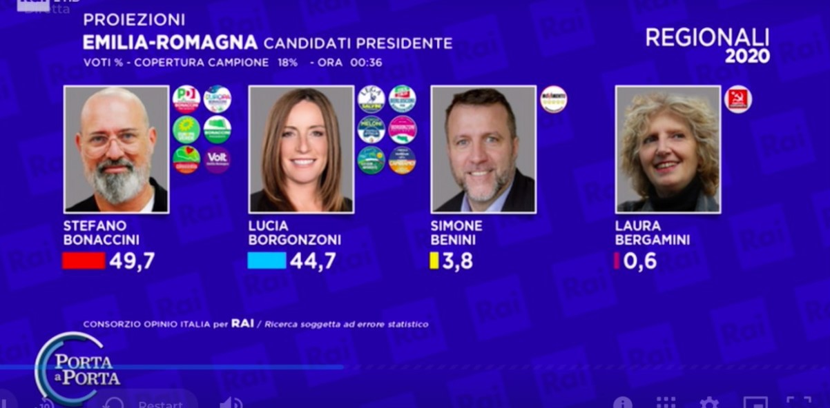 Ore 1.39 – Le nostre analisi, giunti a questo punto della serata, ci danno una certezza. Stefano Bonaccini è stato confermato Presidente della Regione Emilia Romagna.
