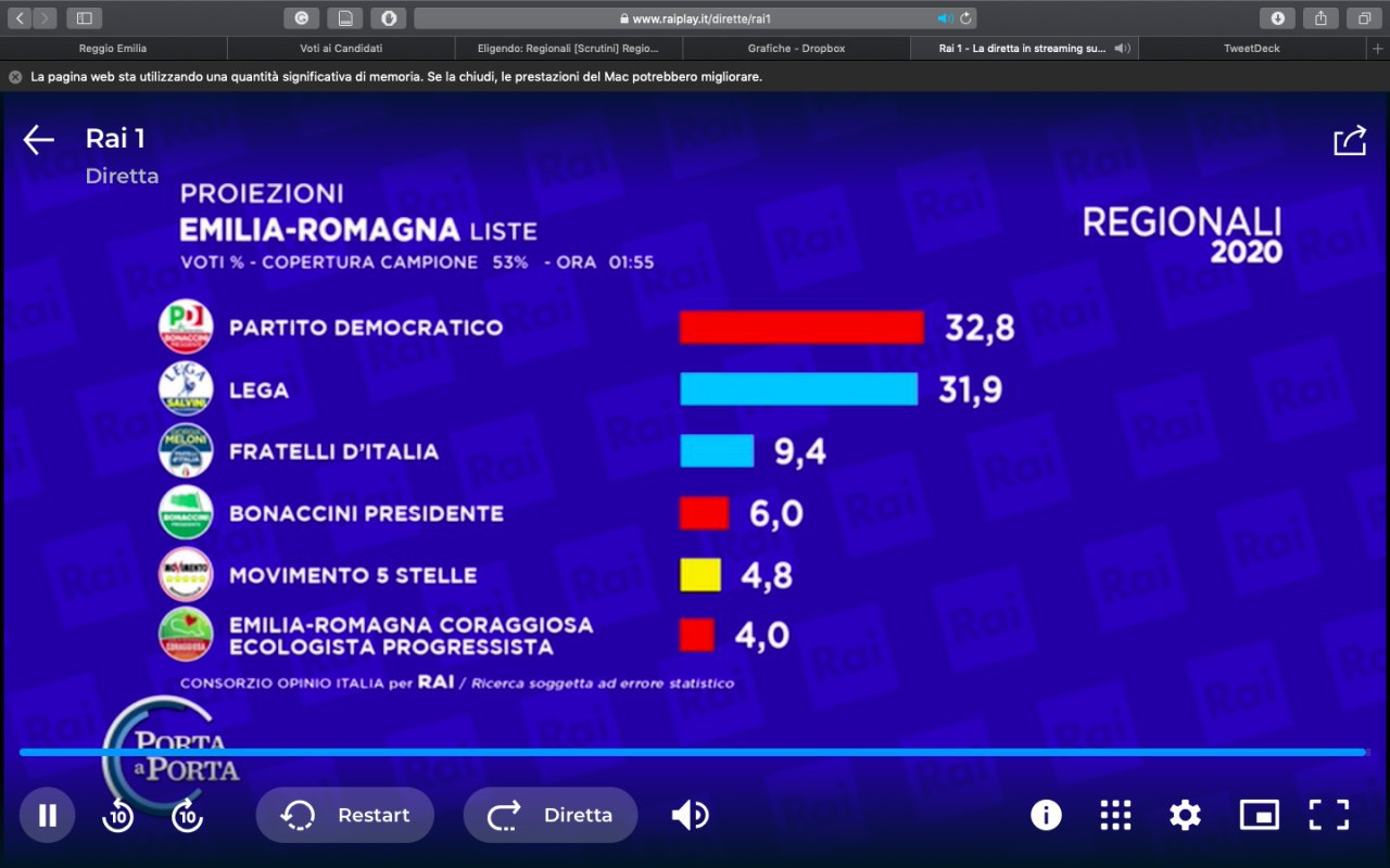 Ore 23.58 – In Emilia Romagna, secondo le proiezioni di SWG per La7, si delineerebbe un testa a testa tra Partito Democratico e Lega per il ruolo di primo partito.