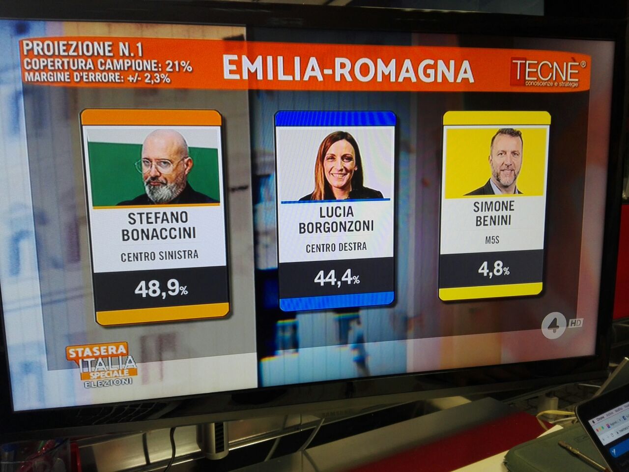 Ore 00.01 – Abbiamo le prime proiezioni del Consorzio Noto per la Rai e di Tecnè per Mediaset: il vantaggio di Stefano Bonaccini (Pd) sarebbe del 2,3% nel primo caso, e del 4,5% per Tecnè, molto più contenuti rispetto a quelli rilevati in precedenza da SWG.