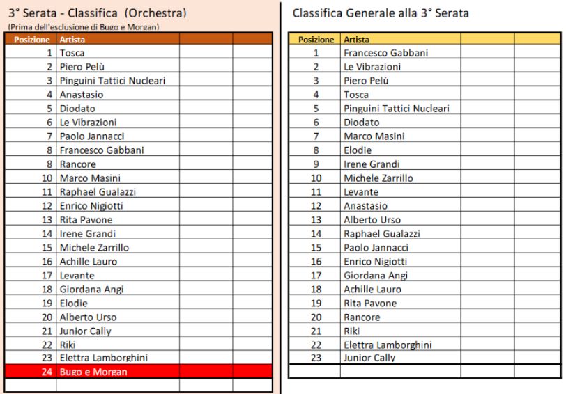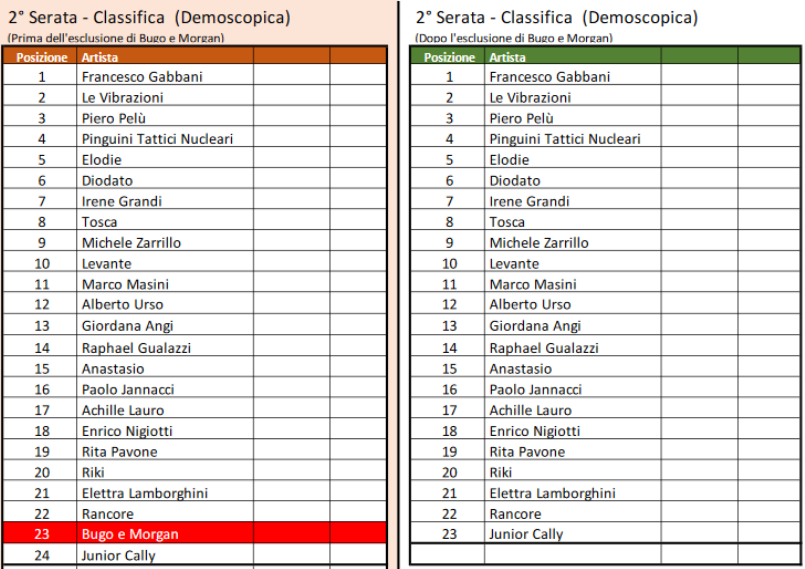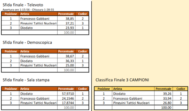 La sala stampa ha infatti continuato a premiare Diodato (21,9%) e Francesco Gabbani (10,3%), rispettivamente al primo e al secondo posto in base al voto dei giornalisti, e gli stessi due cantanti risultavano in cima alla classifica della giuria demoscopica, ma a posizioni invertite.