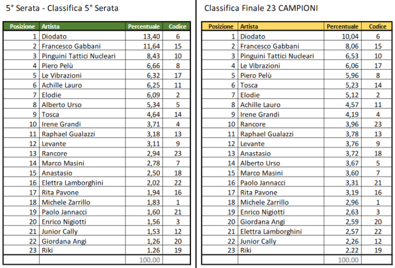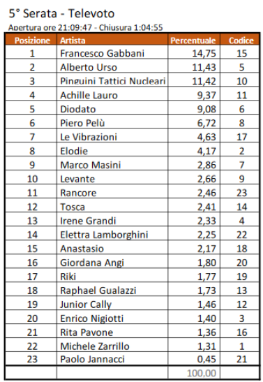 La classifica relativa alla sola quinta serata vedeva dunque in testa Diodato, seguito da Francesco Gabbani e dai Pinguini Tattici Nucleari. Facendo la media con le serate precedenti, la classifica dei primi tre è rimasta identica a quella della sola quinta serata.