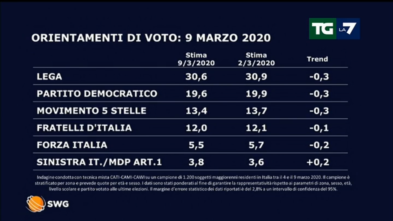 Sondaggi politici SWG, 9 marzo: lievi diminuzioni per tutti i partiti principali