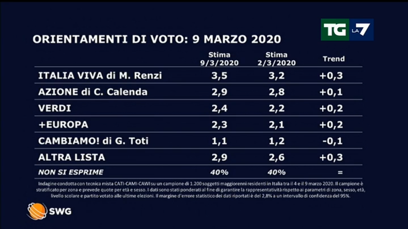 Lega (30,6%), PD (19,6%) e M5S (13,4%) perdono tutti tre decimi, FdI (12%) un decimo e FI (5,5%) 0,2 punti. Italia Viva e Azione restano sotto il 4%.
