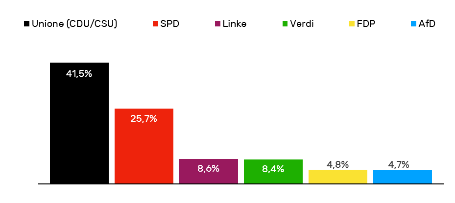 La sera del 22 settembre 2013 Angela Merkel trionfa con il 41,5% dei consensi. Nella sede centrale della CDU a Berlino (la Konrad Adenauer Haus) c’è aria di grande festa: è un risultato che mancava all’Unione dalle elezioni del 1994, le ultime vittoriose per Helmut Kohl. L’entusiasmo, però, aveva portato più di qualcuno a sventolare qualche bandiera tedesca di troppo, e per evitare che quel successo venisse associato a forme di neo-nazionalismo – soprattutto dopo le tante critiche di un’egemonia tedesca in Europa – la cancelliera fece subito in modo che quelle bandiere venissero messe da parte.