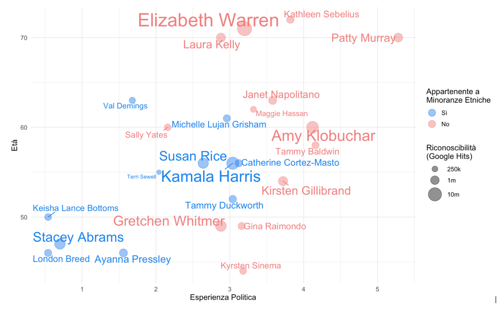 La figura 1 mostra esperienza politica ed età delle 24 politiche sulle due assi: il criterio dell’esperienza va a premiare veterane come la Senatrice di Washington Patty Murray, in Senato dal 1993 e già nel toto-nomi del 2016, penalizzando personalità di spicco più giovani, come la Senatrice della California Kamala Harris e l’ex leader di minoranza della Camera della Georgia Stacey Abrams. Più in generale, a causa delle barriere che donne di colore hanno dovuto storicamente affrontare per accedere a cariche pubbliche, politiche di minoranze etniche tendono a essere più giovani e ad aver accumulato meno esperienze in uffici pubblici. Inoltre, la dimensione di nomi e punti è in proporzione a un’altra importante credenziale delle ‘papabili’ alla vicepresidenza: la loro ‘riconoscibilità’ (name recognition), per cui si è utilizzata come variabile proxy – in assenza di sondaggi comparabili – il numero di risultati per la ricerca del nome completo su Google.