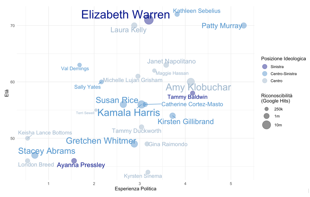 La figura 2 mostra gli stessi dati ma con color-coding per categorie ideologiche (piuttosto generiche e necessariamente soggettive). Forse il dato più interessante è che il nome ‘di sinistra’ con maggior esperienza non è l’ex candidata alle primarie Dem Elizabeth Warren, di gran lunga la più nota della rosa di nomi, ma la Senatrice del Wisconsin Tammy Baldwin. Non a caso, il nome di Baldwin è spesso circolato fra i sostenitori di Sanders come una possibile scelta alla vice-presidenza accettabile sia alla sinistra che all’establishment Democratico.
