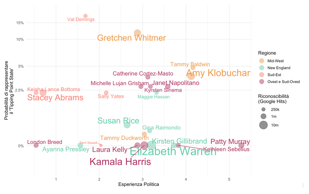 Da questo punto di vista, la scelta migliore sarebbe una candidata che rappresenti la Florida – come la congresswoman Val Deming – o gli stati del Midwest: la governatrice del Michigan Gretchen Whitmer, la Senatrice Baldwin o la Senatrice Klobuchar. Altre possibili scelte strategiche cadrebbero su candidate di stati del Sud Ovest – Nevada, New Mexico e Arizona – o della Georgia, nel Sud-Est, uno stato tradizionalmente repubblicano ma dove i Democratici hanno fatto sostanziali passi avanti nell’ultimo decennio. Per il resto, il criterio dello ‘stato chiave’ va a penalizzare rappresentanti del New England, solidamente democratico, come le Senatrici Gillibrand (New York) e Warren (Massachusetts).