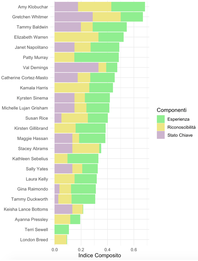 Infine, nella figura 4 è rappresentato un indice composito di ‘vice-presidenziabilità’, che è composto in parte uguale dai valori normalizzati dei tre criteri di esperienza, riconoscibilità e rappresentazione di un possibile stato chiave.
