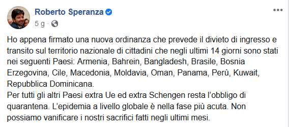 Anche il post di Roberto Speranza che ha ricevuto più interazioni è comunque legato alla regolamentazione dei movimenti tra Stati.