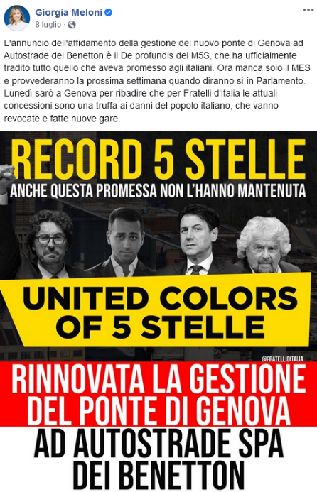 Per Giorgia Meloni, Luigi di Maio e Matteo Renzi hanno creato più engagement i post sulla concessione di Autostrade, mentre Carlo Calenda e Silvio Berlusconi hanno avuto successo con i contenuti della categoria “cultura“.