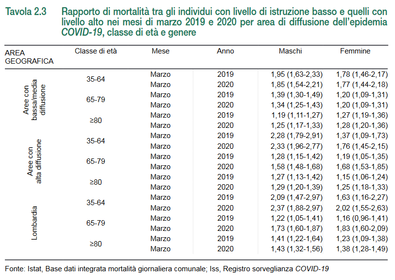 La tabella sottostante mostra i rapporti tra i tassi di mortalità della popolazione meno istruita rispetto a quella più istruita confrontando i tassi di marzo 2019 con quelli di marzo 2020. Le aree più colpite dalla pandemia sono quelle in cui è più dilatata la forbice tra marzo 2019 e marzo 2020. Tra le persone in età lavorativa, le diseguaglianze impattano maggiormente sulla mortalità. Il dato meno confortante arriva dalla Lombardia, dove un maschio in età lavorativa con un titolo di studio basso nel mese di marzo 2020 registrava una probabilità di morte più che doppia (2,37) rispetto ad un suo omologo con un titolo di studio alto.