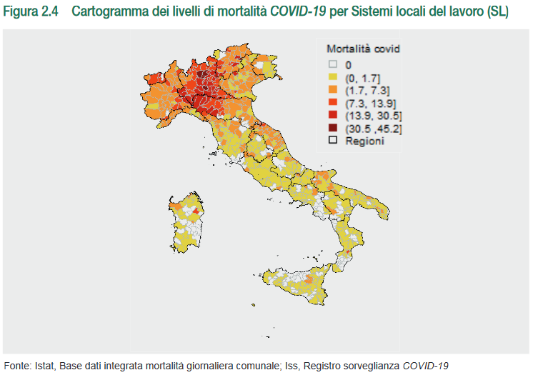Raggruppando invece i tassi di mortalità da Covid-19 per Sistema Locale del Lavoro (decessi Covid-19/10.000 abitanti), si ottiene quest’altra mappa.