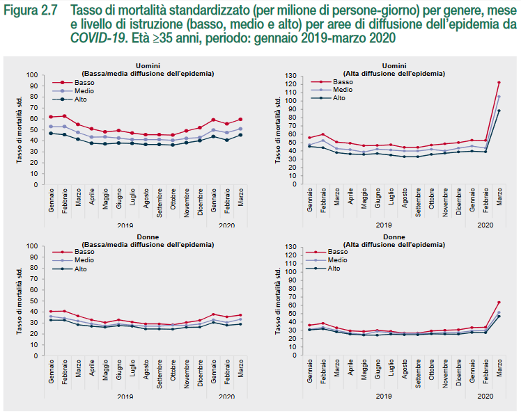 L’emergenza sanitaria di questi mesi ha richiamato l’attenzione su queste diseguaglianze che, dal Rapporto Istat, ne escono accentuate a svantaggio della salute dei gruppi più vulnerabili della popolazione. Il Rapporto, in particolare, studia l’andamento del tasso standardizzato della mortalità da Covid-19 in gruppi omogenei per titolo di studio (considerata la miglior variabile proxy per rappresentare la condizione socioeconomica generale).