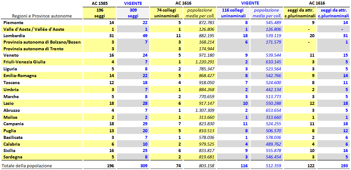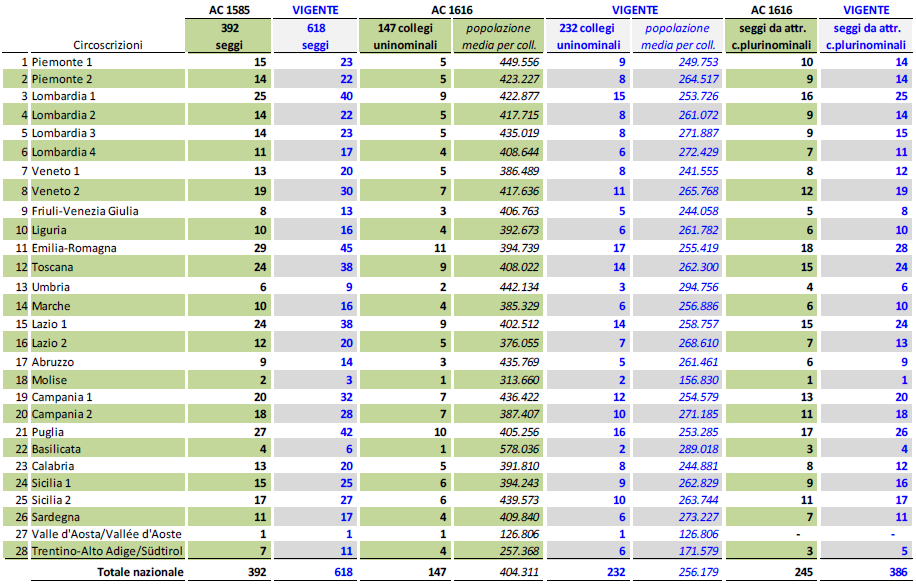 Naturalmente, una riduzione di tale entità impone anche che vengano ridotte nella stessa misura le quote dei seggi riservate agli italiani residenti all’estero (da 12 a 8 alla Camera e da 6 a 4 al Senato). Gli altri seggi (392 a Montecitorio, 196 a Palazzo Madama) continuerebbero a essere assegnati in proporzione alla popolazione di ognuna delle 28 circoscrizioni alla Camera, mentre al Senato ciò continuerà ad avvenire su base regionale, con l’eccezione del Trentino-Alto Adige che – novità prevista dalla riforma – sarebbe scorporato nelle due Province autonome (Trento e Bolzano) che lo compongono. In più, per l’elezione del Senato, il numero minimo di seggi spettanti a ogni Regione verrebbe abbassato da 7 a 3 (con l’eccezione del Molise, che continuerebbe ad avere due seggi, e della Valle d’Aosta, che ne avrebbe sempre uno solo).