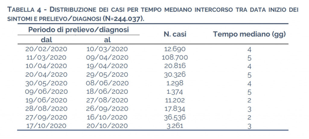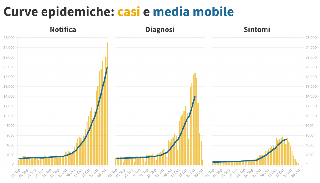 La curva dei sintomatici, come già detto, è basata su quanto dichiarato dalle persone positive. I tempi mediani tra l’inizio dei sintomi e il prelievo del tampone sono variati nel tempo, ma negli ultimi giorni di ottobre sono di tre giorni, secondo l’ISS.