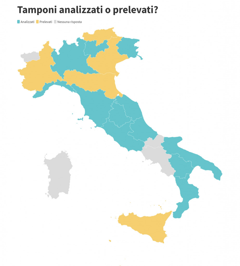 Per ricostruire la situazione, al meglio delle nostre capacità, abbiamo contattato tutte le RegionI/PA chiedendo se i tamponi fossero prelevati o analizzati. Ci hanno risposto in 17 su 21. Le regioni mancanti sono la Valle d’Aosta, la Campania, il Molise e la Sardegna.