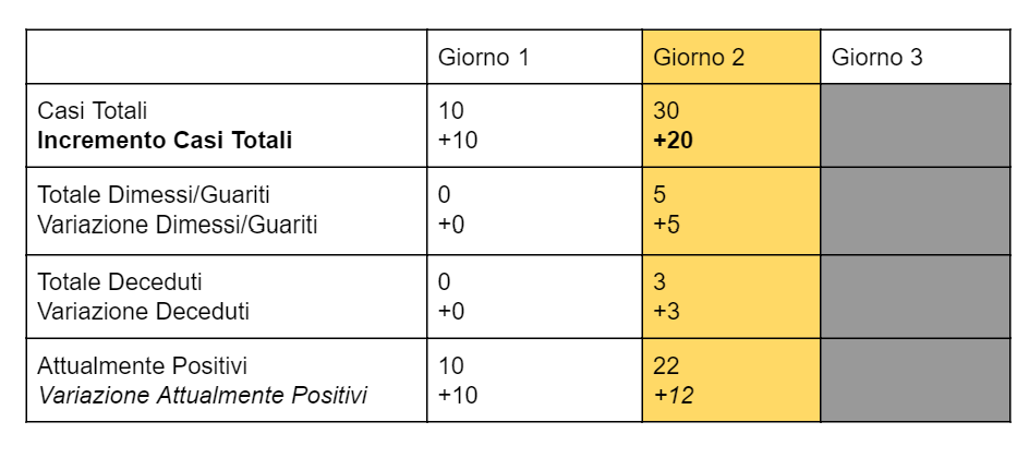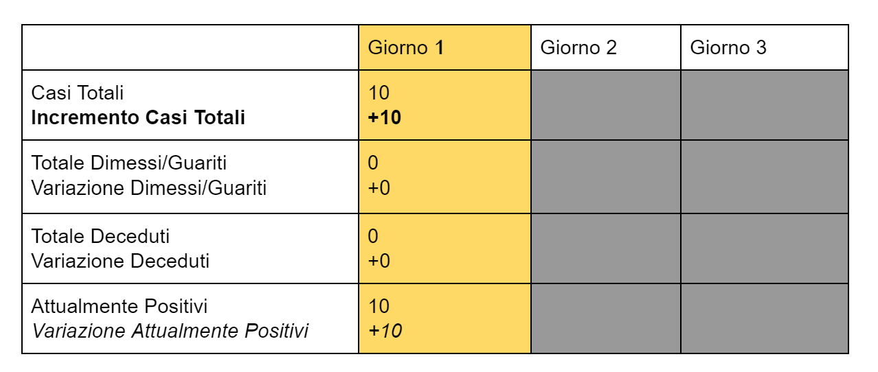• Il giorno 1, dall’analisi dei tamponi risultano positive 10 persone, 0 dimessi/guariti e 0 deceduti: l’incremento dei casi positivi è quindi di 10 e la variazione dei casi attualmente positivi è 10-0-0 = 10.