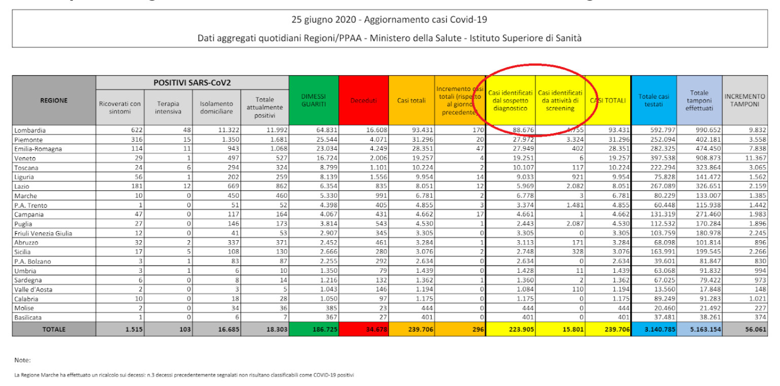 Dal 25 giugno 2020, i report giornalieri della Protezione Civile segnalano i casi identificati dal sospetto diagnostico e i casi identificati da attività di screening.
