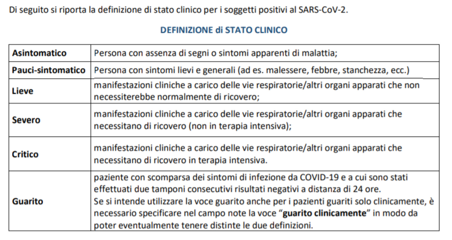 3) Stato clinico: asintomatico, paucisintomatico, lieve, severo, critico, guarito?