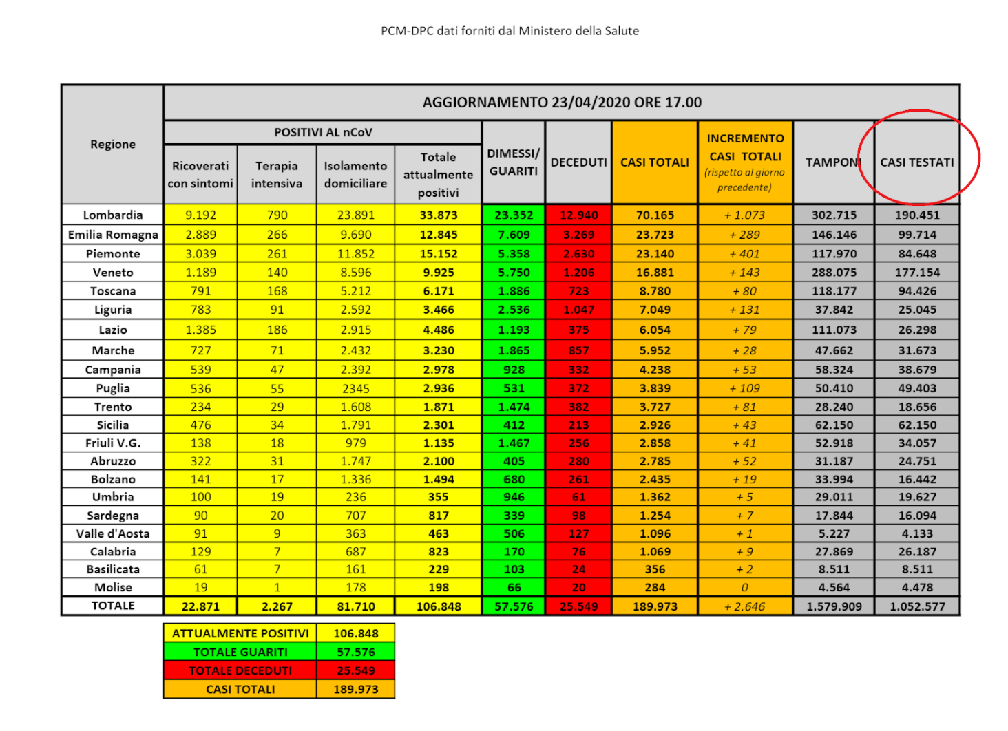 Soprattutto, è falso che l’Incremento dei Casi Totali sia il numero di nuove persone positive che ieri non erano considerate tali più la variazione dei Dimessi/Guariti più la variazione dei Deceduti.