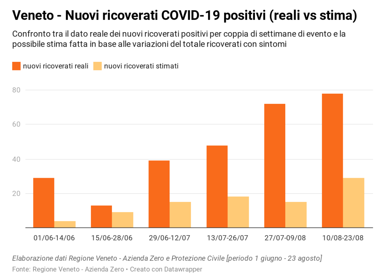 È possibile stimare l’andamento del numero di nuovi ricoveri di pazienti COVID-19 positivi a partire dalle variazioni del totale ricoverati? Si, ma in maniera molto approssimata utilizzando i saldi giornalieri (si fanno le differenze tra un giorno e l’altro e si considerano solo i numeri positivi, segno che qualcuno è stato di sicuro ricoverato). I dati del Veneto, disponibili nella infografica curata da Azienda Zero, mostrano quanto l’approssimazione possa essere lontana dalla realtà.