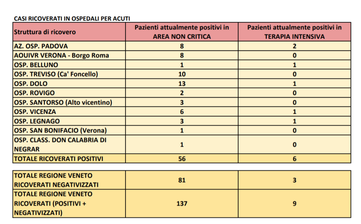 Sempre guardando ai dati della Regione Veneto, si può tener conto dei dei negativizzati ancora ricoverati in area non critica o in terapia intensiva. A titolo di esempio, si riporta il report del 28/08/2020 ore 17:00 di Azienda Zero per Regione Veneto: i ricoverati positivi sono 56 mentre i ricoverati negativizzati sono 81, per un totale di 137 ricoverati.