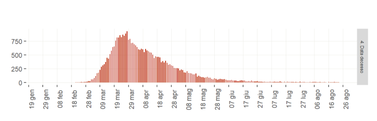 Per avere la curva dei decessi per data di registrazione bisogna ricorrere ai report settimanali dell’ISS pubblicati il sabato. Quello datato 25 agosto mostra la seguente curva: