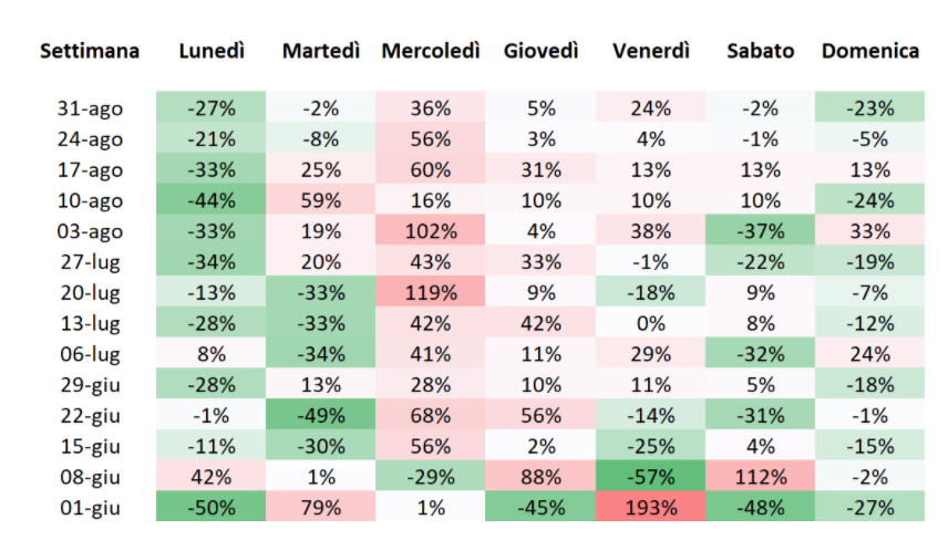 Nell’immagine si possono vedere le variazioni giornaliere dei casi rispetto al giorno precedente. Il lunedì si ha quasi sempre un calo, mentre il martedì è più variabile. La massima crescita dei casi la si ha il mercoledì e anche giovedì e venerdì tendenzialmente crescono. Il sabato e la domenica sono più variabili.