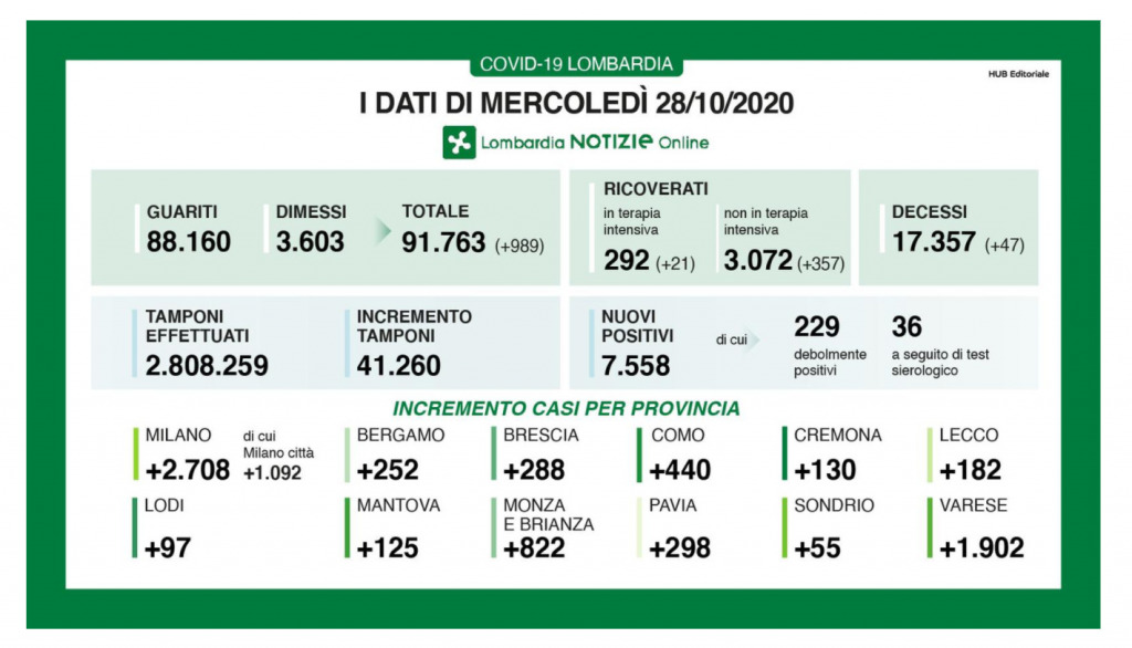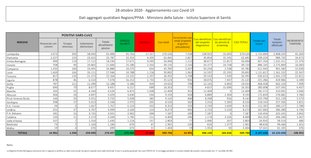 Ogni giorno, la Protezione Civile pubblica delle tabelle riepilogative di aggiornamento casi Covid-19. A titolo di esempio, qui di seguito la tabella riepilogativa del 28 ottobre 2020.