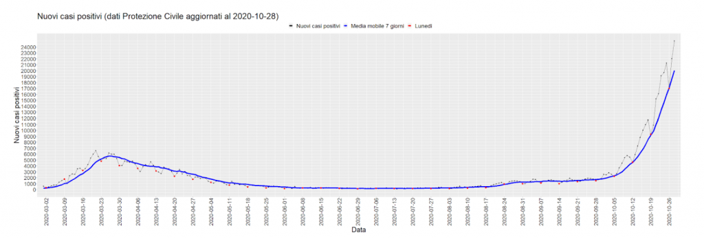 Nuovi casi positivi dal 1° marzo 2020 al 4 settembre 2020. I puntini rossi rappresentano i nuovi casi positivi comunicati il lunedì, relativi almeno al giorno precedente.