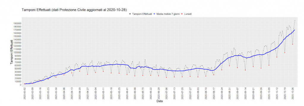 Tamponi effettuati dal 2 marzo 2020 al 4 settembre 2020. I puntini rossi rappresentano i tamponi effettuati comunicati il lunedì, relativi almeno al giorno precedente.