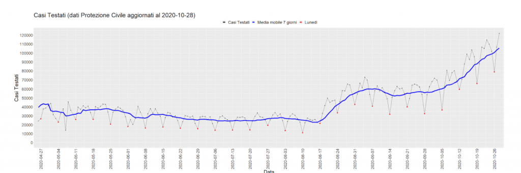 Casi testati dal 26 aprile 2020 al 4 settembre 2020. I puntini rossi rappresentano i casi testati comunicati il lunedì, relativi almeno al giorno precedente.