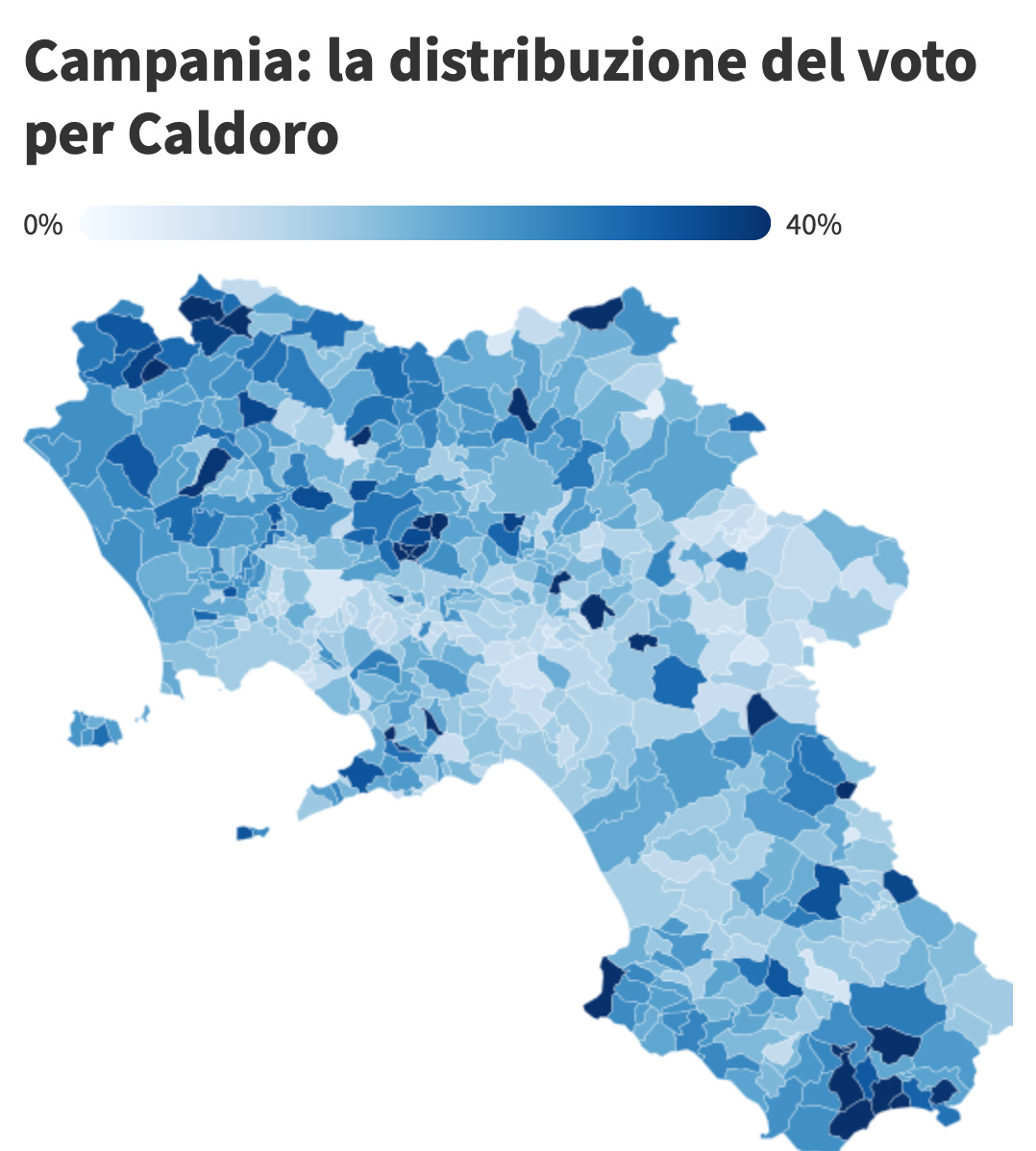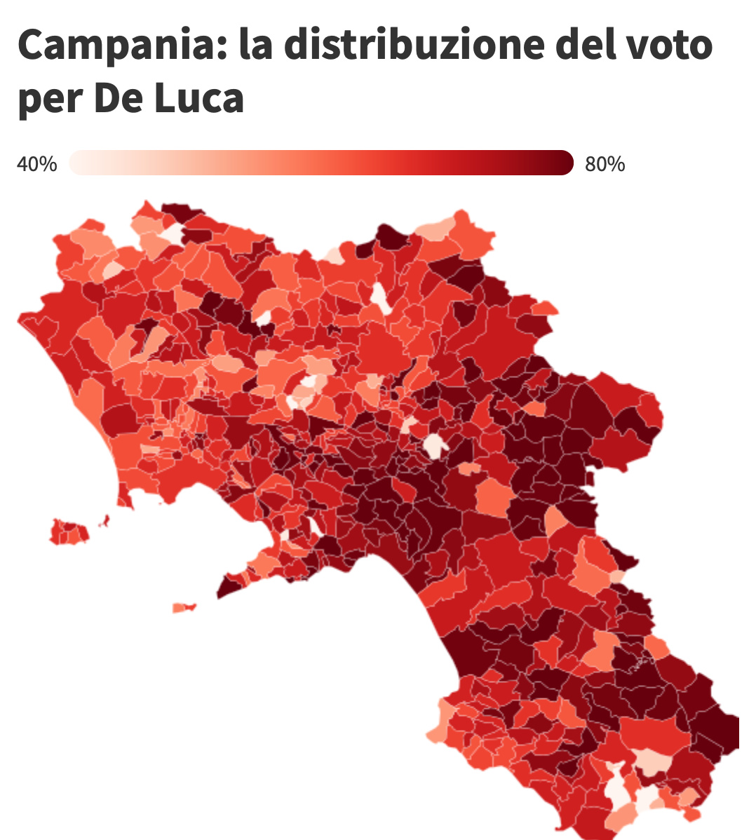 Nel dettaglio, i risultati migliori per De Luca vengono dalle province di Salerno (città di cui lo “sceriffo” è stato sindaco per molti anni) e di Avellino. Il margine di vittoria è invece più ristretto (ma comunque significativo) nelle province di Benevento e Caserta. I risultati migliori per Caldoro si registrano in alcuni comuni dell’alto casertano, al confine con il Lazio, e in alcuni comuni del basso Cilento, al confine con la Basilicata.