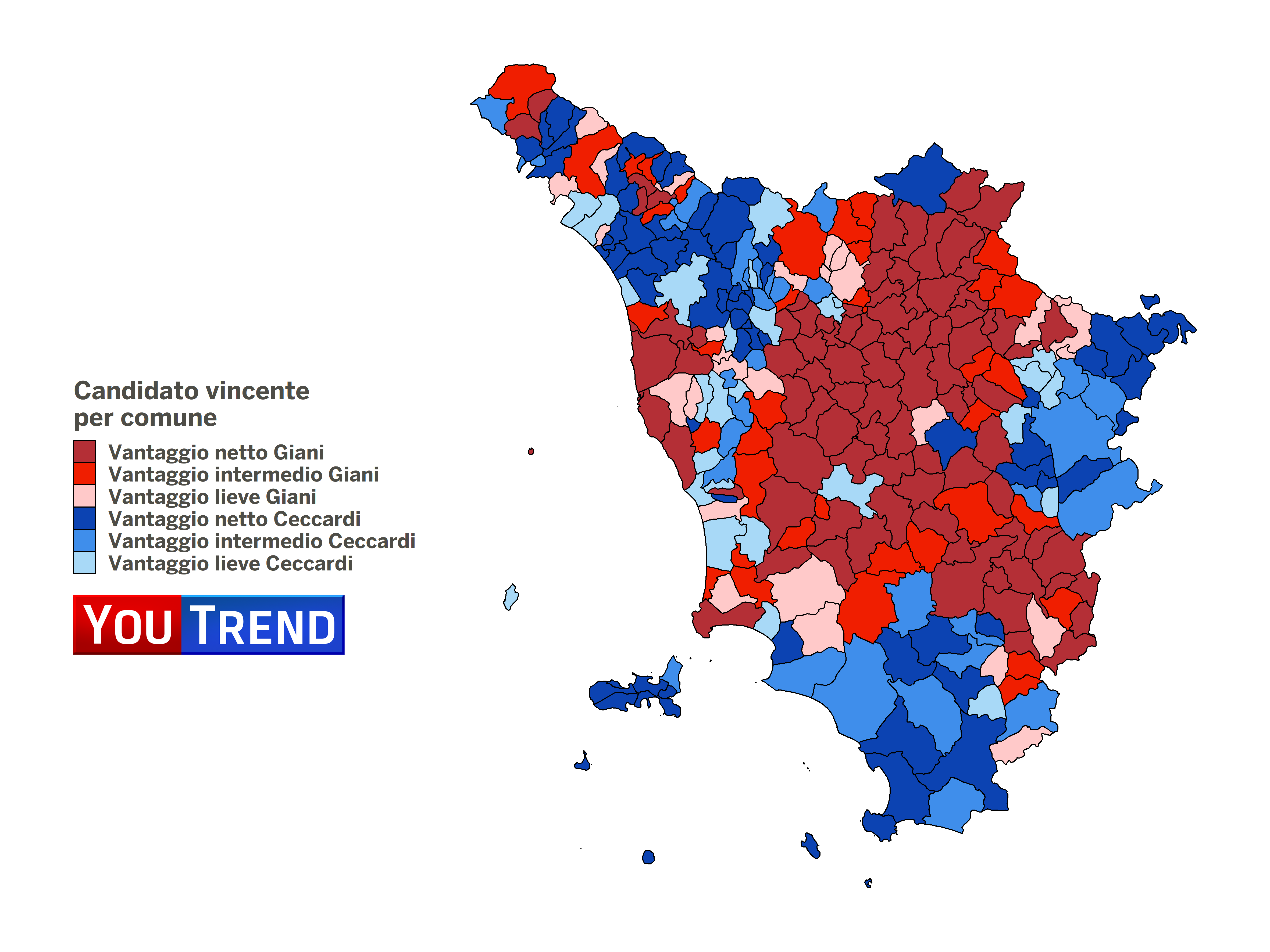 Segnaliamo che Eugenio Giani ha vinto con 10 punti di margine anche a Cascina, il comune in Provincia di Pisa in cui quattro anni fa Susanna Ceccardi fu eletta Sindaco. A Cascina, peraltro, si sono tenute anche le elezioni amministrative, e ci sarà un ballottaggio con il candidato del centrosinistra che parte in vantaggio su quello di centrodestra. Se invece si osservano i risultati di Empoli, città natale di Giani, il vantaggio del Presidente eletto sulla Ceccardi risulta essere di 25 punti.