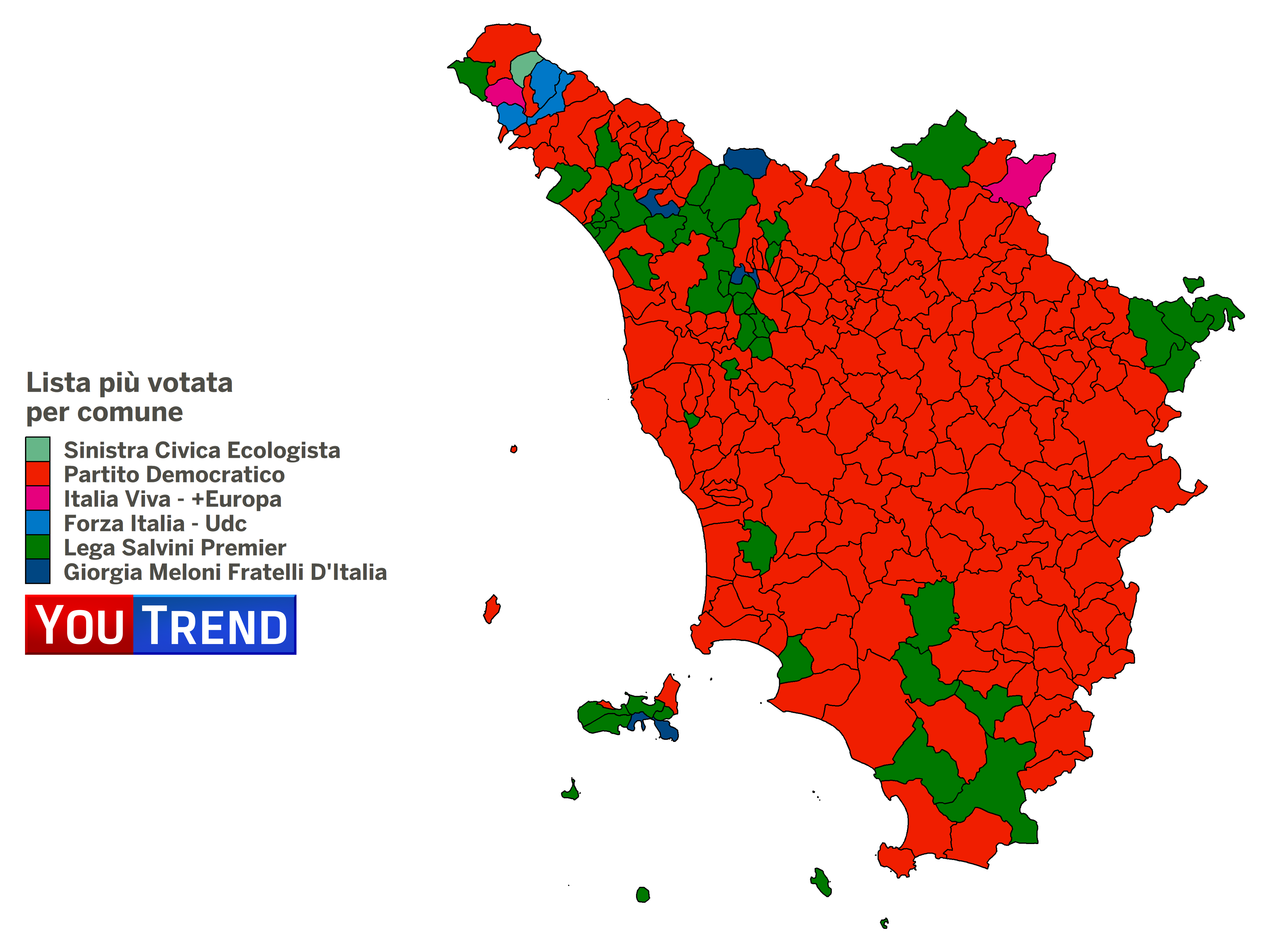 Il Partito Democratico è la prima forza nella gran parte dei comuni, prevalendo soprattutto nel centro della Regione e sulla costa pisana e livornese. La Lega ottiene invece lo scettro di primo partito in alcuni comuni della Maremma, nella Valtiberina (la parte più orientale della Provincia di Arezzo), in alcuni comuni fra le province di Pistoia, Lucca e Massa-Carrara e sull’Isola d’Elba. Fratelli d’Italia è primo partito in quattro comuni in queste stesse zone, mentre Forza Italia vince in tre comuni della Lunigiana (al confine con la Liguria). La lista che unisce Italia Viva e +Europa è invece la più votata a Mulazzo (ancora in Lunigiana) e a Marradi (nel Mugello, al confine con l’Emilia-Romagna, dove ha superato il 50%).