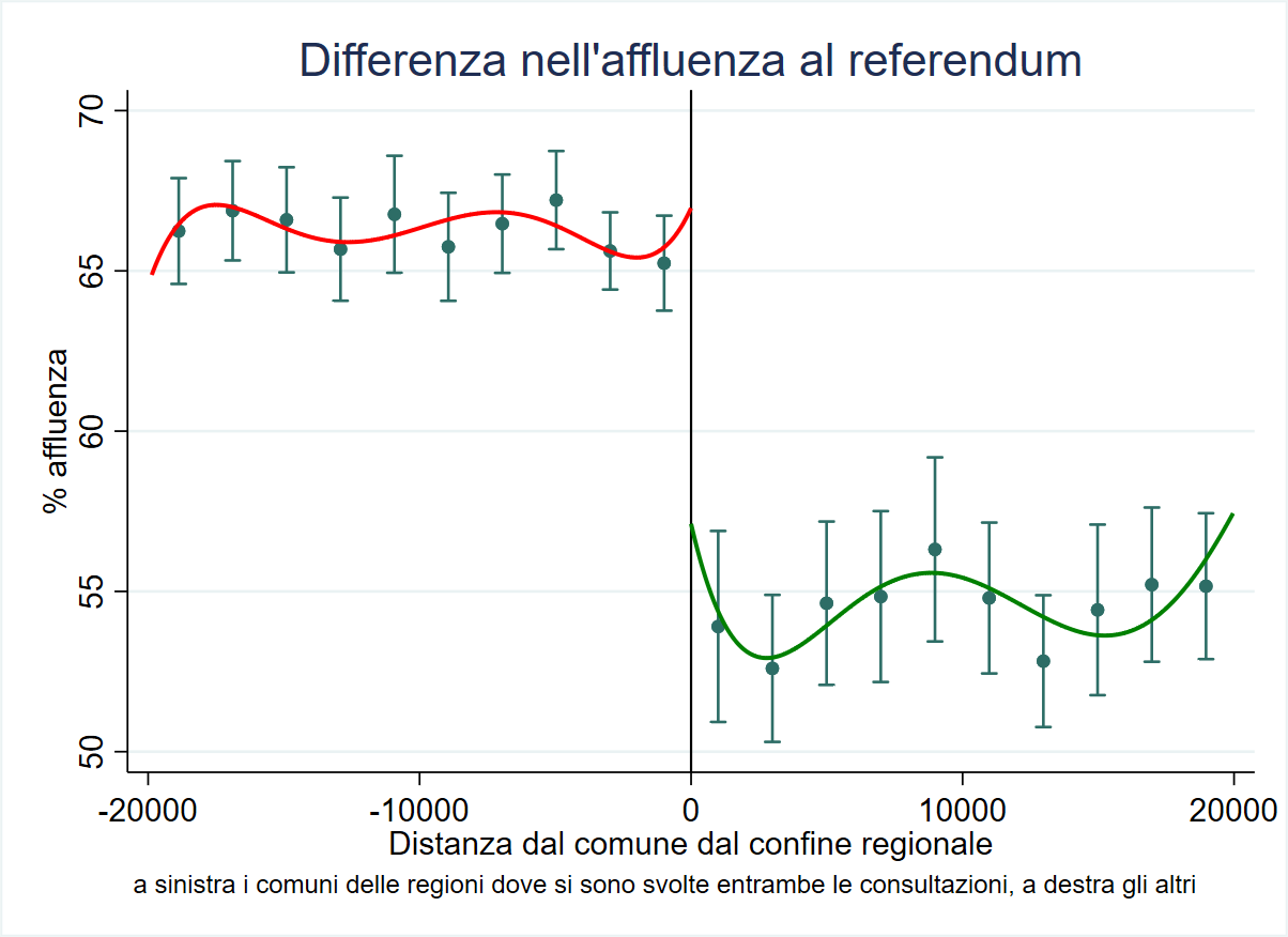 Il primo risultato della nostra analisi è chiarissimo: la presenza delle regionali ha causato un netto aumento dell’affluenza nel referendum, come si può vedere dal grafico della Figura 2. I pallini a sinistra del grafico rappresentano l’affluenza nei comuni delle regioni dove si sono tenute anche le elezioni regionali, a destra invece gli altri. La linea al centro del grafico rappresenta il confine regionale: più un pallino è lontano dalla linea verticale, più il comune che esso rappresenta è lontano dal confine regionale. L’affluenza da un lato e dall’altro del confine sembra abbastanza stabile, ma in prossimità degli ultimi 20 km dal confine osserviamo una netta discrepanza. Più precisamente, l’affluenza nei comuni in cui si sono tenute anche le elezioni regionali in prossimità del confine si attesta attorno al 65%, mentre se consideriamo i comuni in cui si è tenuto solo il referendum, sempre in prossimità del confine, l’affluenza scende al 54%. In altre parole, secondo le nostre stime basate sui comuni di confine, a parità di altre condizioni la presenza delle elezioni regionali avrebbe aumentato l’affluenza in media di 11 punti percentuali.