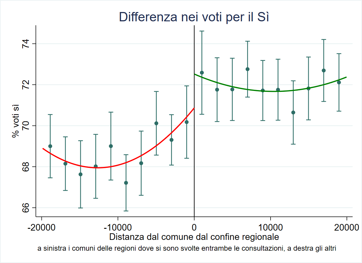 Figura 3 – Discontinuità nel voto per il sì. La distanza del comune dal confine regionale si riferisce al centroide di ciascun comune ed è riportata in metri