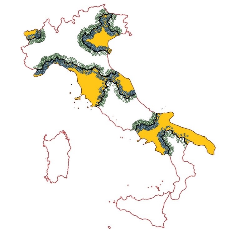 Confrontare le percentuali nelle regioni dove si è svolto solo il referendum con quelle nelle regioni in cui si sono svolte anche le consultazioni regionali sarebbe assai fuorviante, perché avrebbe ignorato diversi fattori locali che niente hanno a che fare con le date del voto. Abbiamo quindi adottato una strategia più precisa: abbiamo confrontato i risultati soltanto nei comuni vicino al confine delle regioni dove si sono svolti entrambi i tipi di consultazioni. Questi comuni sono evidenziati nella figura 1. L’idea di fondo è che i comuni “subito di qua” e “subito di là” dal confine regionale siano assai simili tra di loro: la differenza più significativa da un lato all’altro del confine che ha potuto influenzare il voto del 20 e 21 settembre è stata la presenza o meno delle elezioni regionali. Se quindi guardiamo all’affluenza e alle percentuali del sì e del no restringendo la nostra indagine solo a questi comuni, abbiamo maggiori speranze di capire più precisamente se la coincidenza delle consultazioni ha modificato il comportamento degli elettori. Questo tipo di tecnica in statistica ed econometria viene denominata disegno con regressione discontinua (o regression discontinuity design in inglese).
