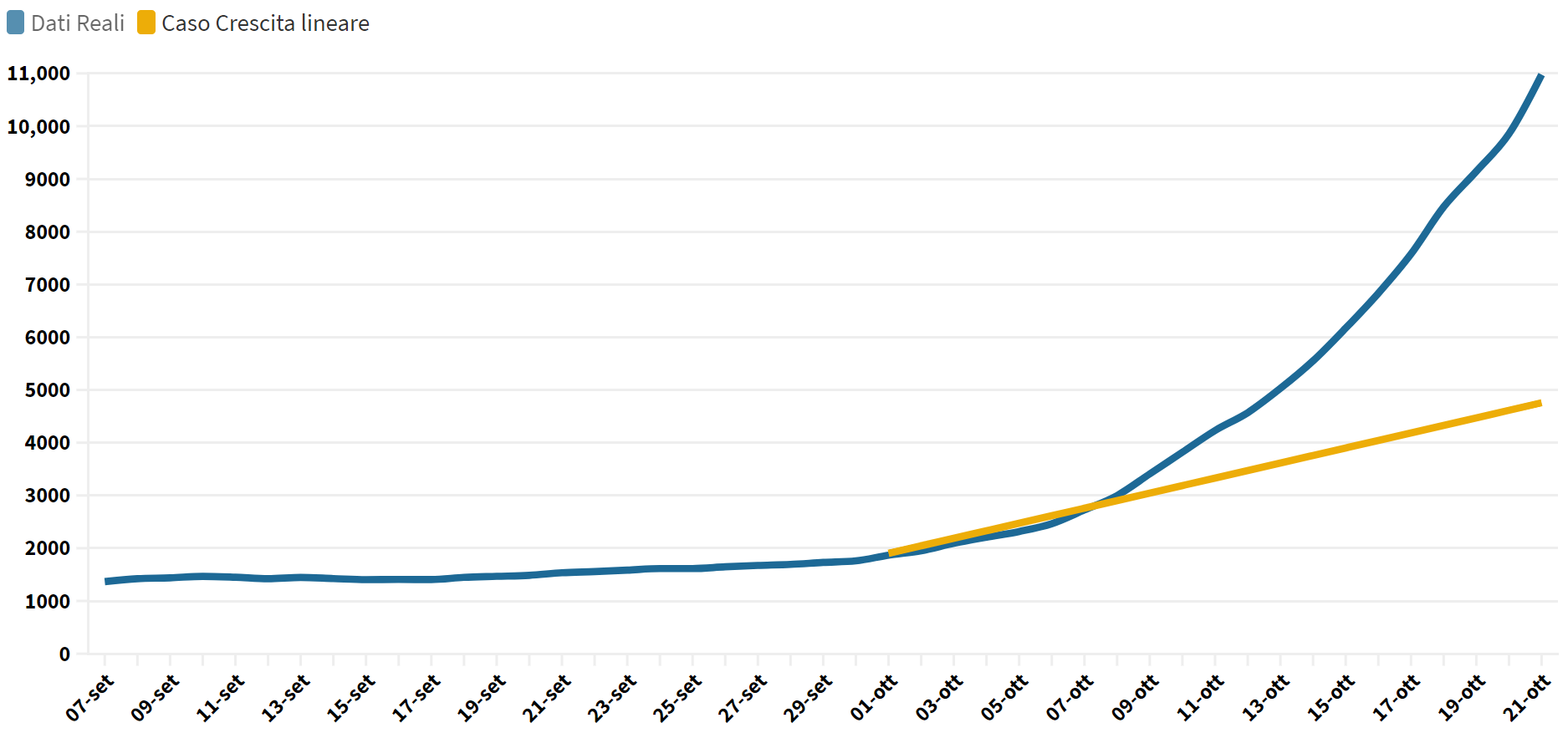 Risulta evidente come, da circa 20 giorni, la crescita dei casi si sia allontanata notevolmente da un’ipotetica crescita lineare, calcolata nel caso vi fosse stato un incremento fisso dell’aumento dei positivi rispetto al giorno precedente, pari alla media della prima settimana di ottobre (circa 140).