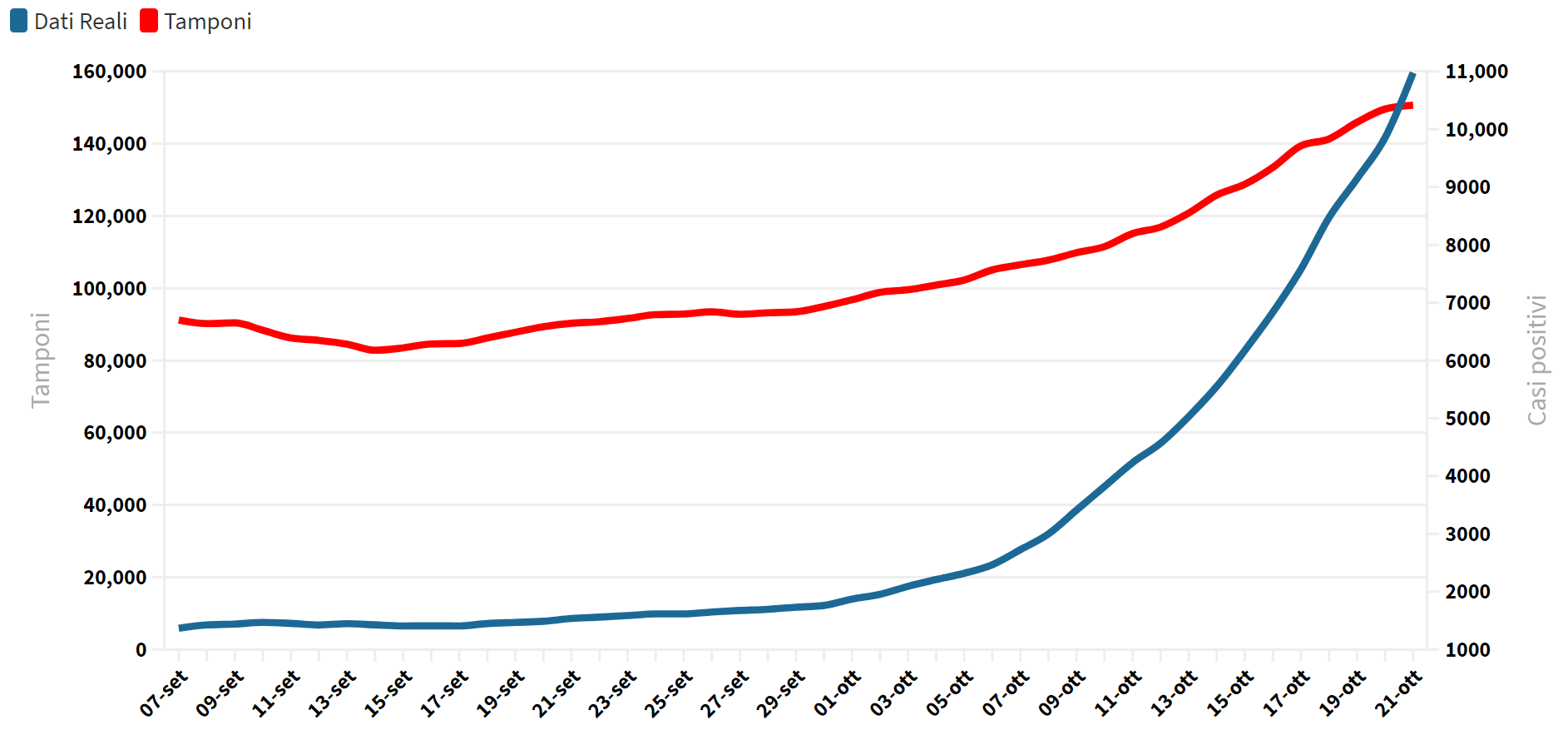 Questo tipo di crescita diventa ancora più evidente se confrontato col numero di tamponi effettuati nello stesso periodo, come si vede dal grafico seguente.