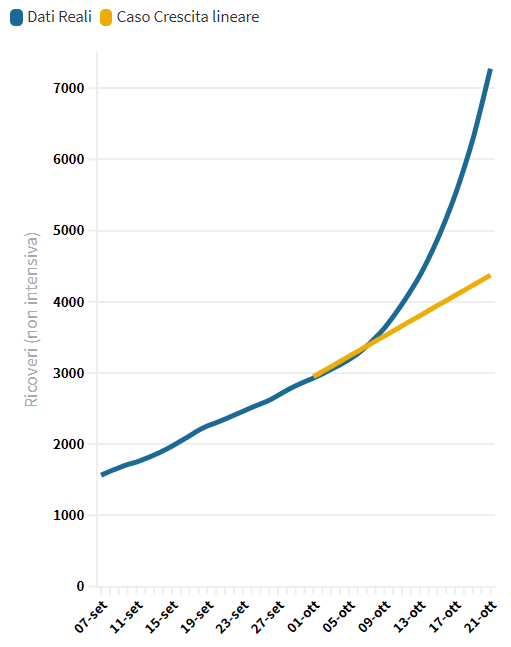 Prendendo come riferimento delle terapie intensive il numero massimo raggiunto nella prima ondata di 4.068 letti occupati (3 aprile), diventa facilmente osservabile come una crescita esponenziale raggiungerebbe questo valore critico entro 19 giorni. Al contrario una crescita lineare impiegherebbe più tempo, circa 30 giorni.