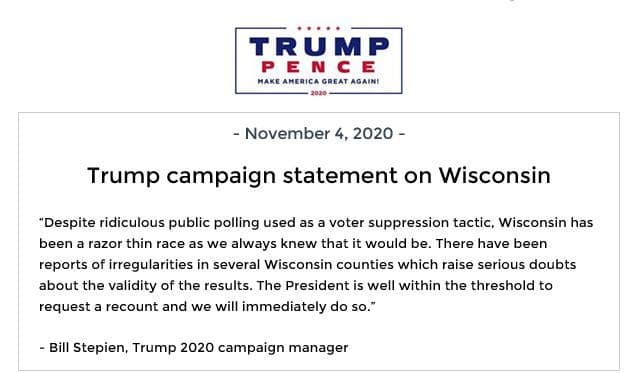 Sin dal momento in cui i network hanno assegnato a Joe Biden la vittoria in Wisconsin, lo staff della campagna di Donald Trump ha dichiarato di voler richiedere un riconteggio.