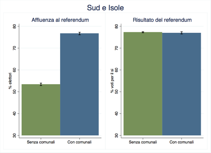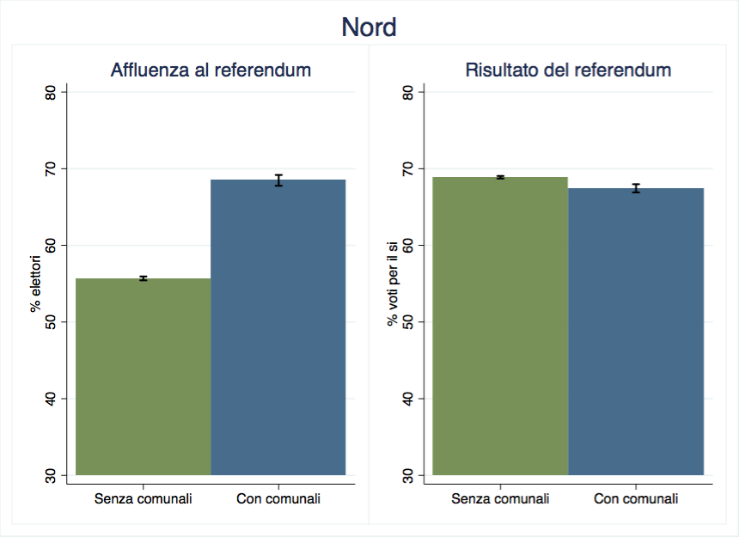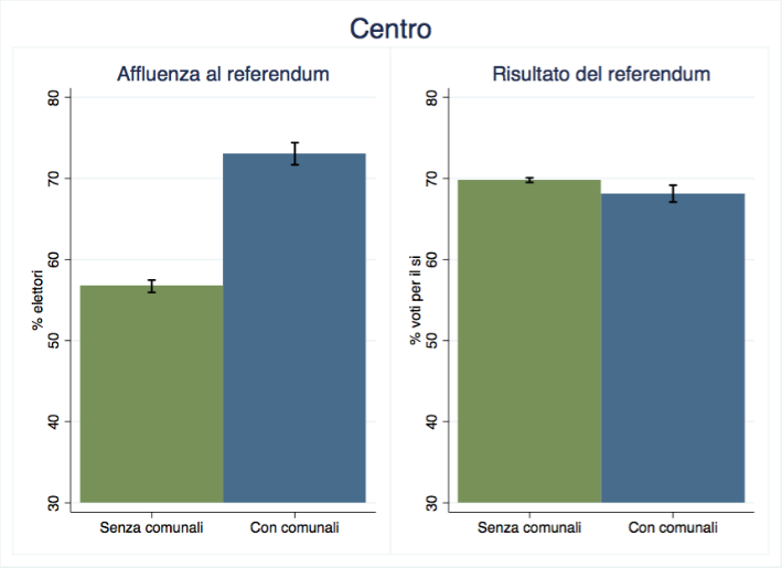 Per capire se la compresenza delle elezioni comunali abbia influenzato gli elettori nella partecipazione e nella scelta del voto costituzionale, abbiamo confrontato l’affluenza e la percentuale di sì nei comuni dove si sono svolte entrambe le consultazioni con gli stessi risultati nei comuni dove invece le comunali non ci sono state. Questo metodo ci sembra legittimo perché la compresenza di comunali e referendum è qualcosa che possiamo quasi considerare random, successo “per caso”, senza un’influenza da parte degli elettori: gli economisti lo chiamerebbero “un esperimento quasi naturale”.