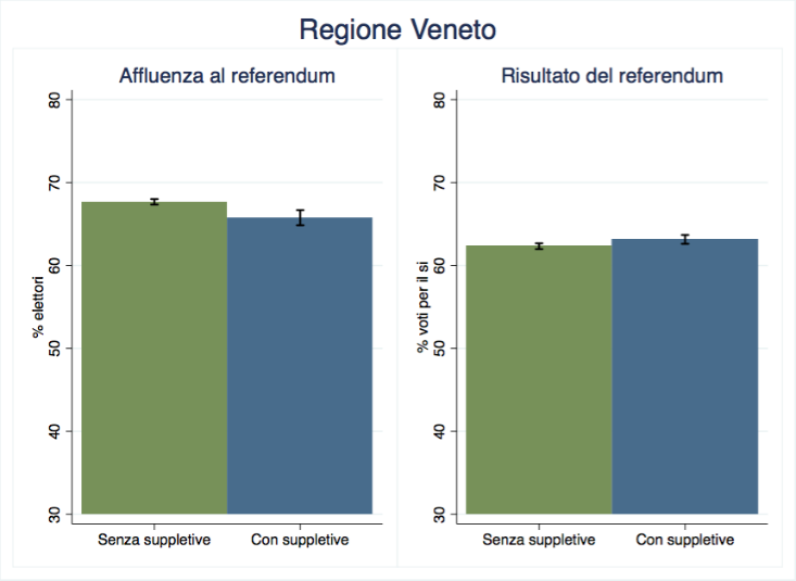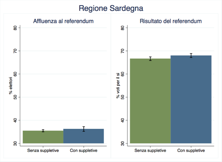Stavolta, abbiamo confrontato i comuni interessati dalle suppletive solo con gli altri comuni appartenenti alla stessa regione, invece che con la totalità degli altri comuni italiani. Riteniamo che questo confronto, essendo più omogeneo, possa portare a risultati ancor più attendibili per i comuni coinvolti. In questo caso dai dati non emerge nessun netto effetto delle suppletive. Le suppletive sono associate ad una partecipazione leggermente superiore in Sardegna e leggermente inferiore in Veneto (nell’ordine dei due punti percentuali). Invece, lo scostamento dei voti a favore del sì (o, di converso, a favore del no) appare non rilevabile in entrambe le regioni. I grafici nella figura 4 riportano graficamente questi risultati.