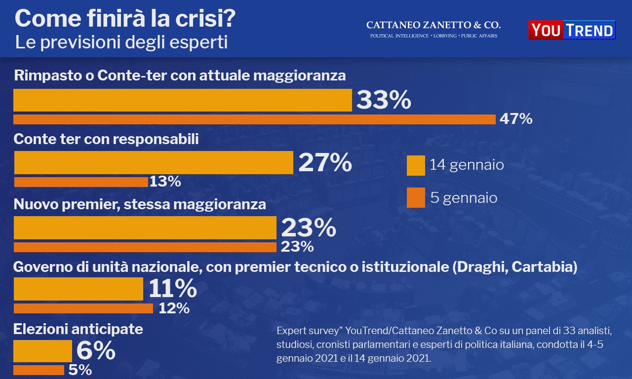 Ieri Matteo Renzi ha annunciato le dimissioni delle ministre di Italia Viva, Teresa Bellanova ed Elena Bonetti, e del sottosegretario Ivan Scalfarotto, aprendo una crisi di Governo preannunciata già da diverse settimane. YouTrend, insieme a Cattaneo Zanetto & Co, ha cercato di capire come potrebbe finire questa crisi, sottoponendo i possibili scenari a un panel di 33 giornalisti ed esperti di politica italiana.