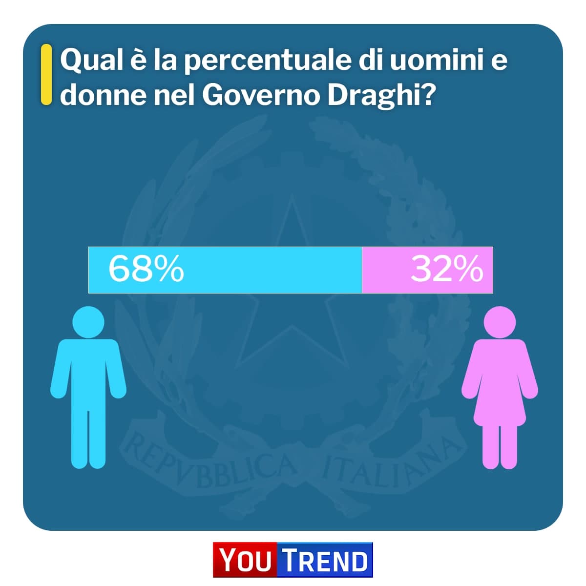 Nel nuovo governo gli uomini sono 17 (68%) e le donne 8 (32%). Le 8 donne occupano 5 ministeri senza portafoglio e 3 ministeri con portafoglio, mentre gli uomini occupano 3 ministeri senza portafoglio e 12 con portafoglio – oltre alla Presidenza e alla Segreteria del Consiglio dei Ministri.