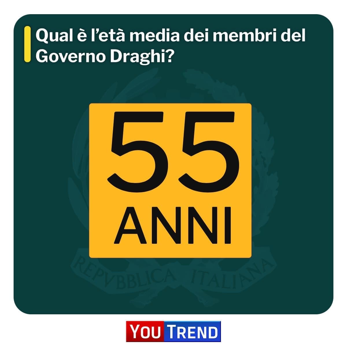 L’età media dei 25 membri del nuovo governo è di 55 anni: il più giovane è Luigi Di Maio, nato nel 1986, mentre il più anziano è proprio il Presidente del Consiglio Mario Draghi, classe 1947.