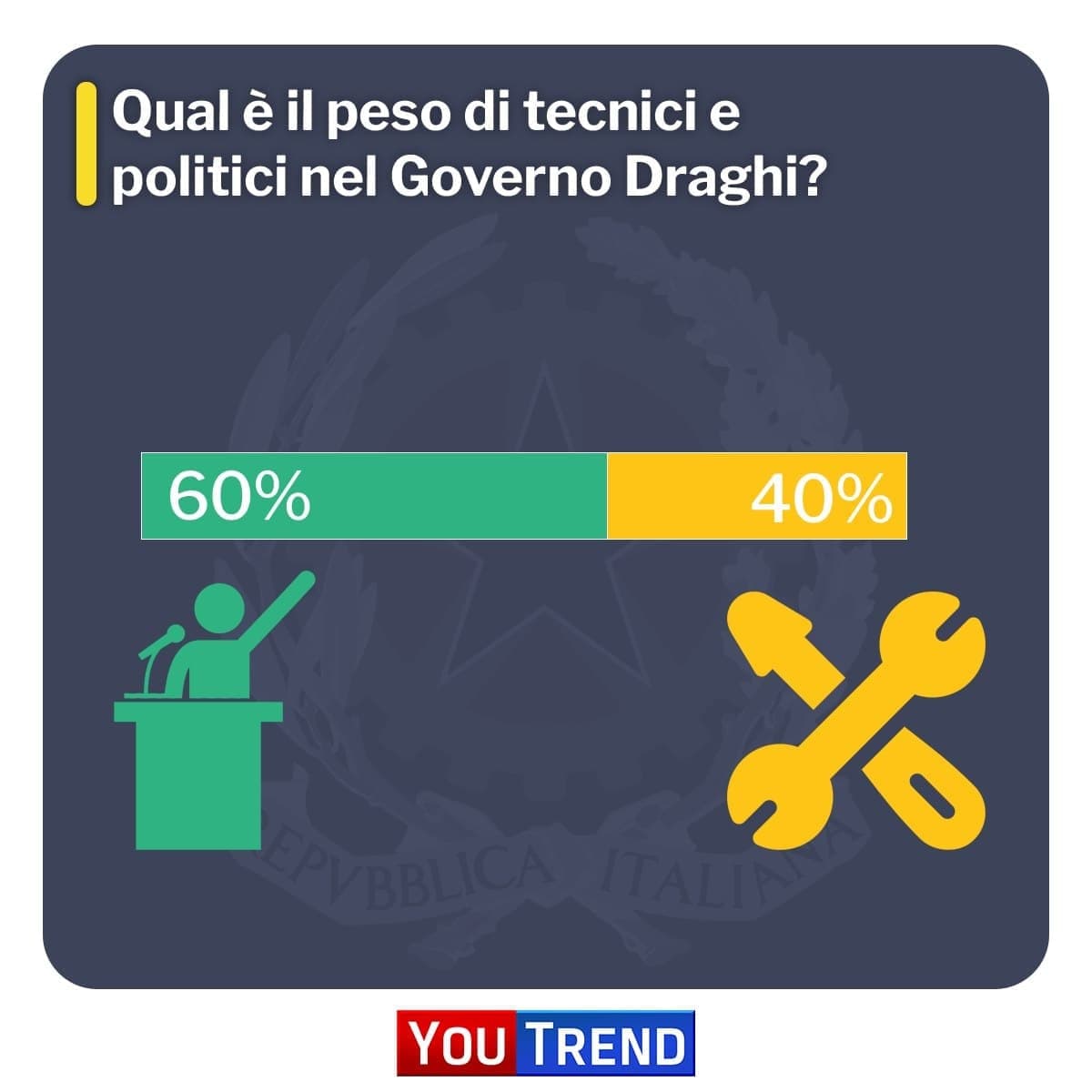 Con la nascita del Governo Draghi, il Movimento 5 Stelle ha sostenuto tutti e 3 i governi di questa legislatura. PD, Lega, Liberi e Uguali e Italia Viva ne hanno invece sostenuti 2 su 3, Forza Italia 1 su 3 e Fratelli d’Italia nessuno. Inoltre, dei 25 membri del nuovo governo, 9 erano già ministri nel governo uscente guidato da Giuseppe Conte: di essi, 2 hanno cambiato ministero (Dadone e Patuanelli), mentre 7 sono rimasti nel ministero che già occupavano.
