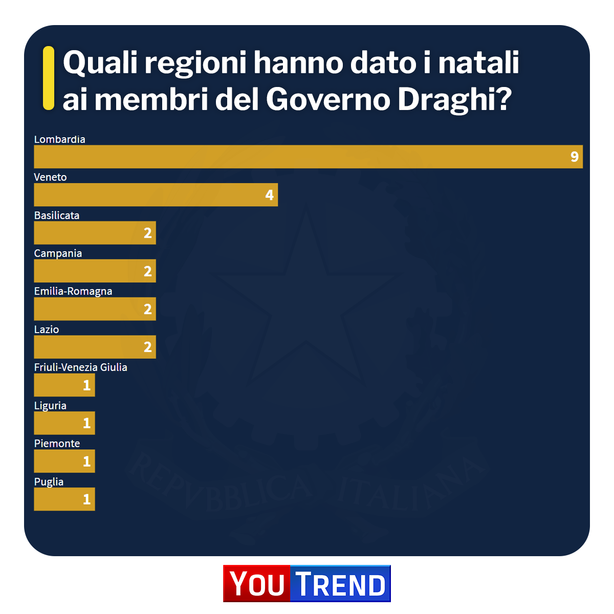 Infine, dei 25 membri del nuovo Governo Draghi, 9 sono nati in Lombardia, 4 in Veneto e 2 in Lazio, Emilia-Romagna, Campania e Basilicata. Un membro del Governo, infine, per Friuli-Venezia Giulia, Piemonte, Liguria e Puglia.