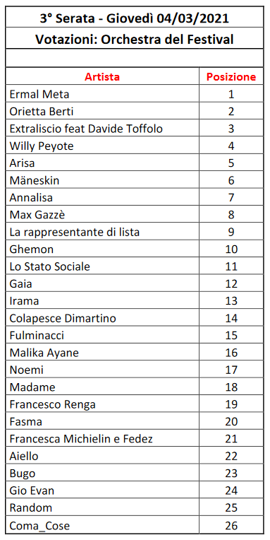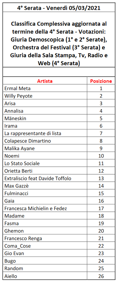 Calcolando la nuova media con le serate precedenti, scopriamo come il voto dei giornalisti accreditati abbia consentito alla band romana di raggiungere il 5° posto nella classifica generale, nella quale in testa ha continuato ad esserci Ermal Meta, seguito da Willie Peyote, Arisa e Annalisa. Da notare inoltre come in questo momento, alla vigilia della finale, Fedez e Francesca Michielin siano solamente in 17a posizione.
